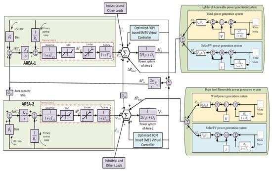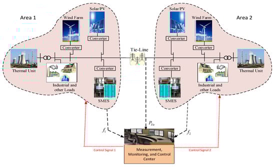 To analyze frequency control in the presence of RESs, adequate dynamic model of the studied system is constructed. For precise demonstration of the dynamic behavior of interconnected system, generally higher order nonlinear models for thermal generating units, wind system, solar PV, converters are considered. For large power system with power electronic converters, however, the simplified dynamic models are employed to study the frequency stability. The interested readers can find more details on such dynamic modeling in [,]. For frequency stability analysis, the simplified dynamic model of the two area system can be developed as shown in Figure 2.
