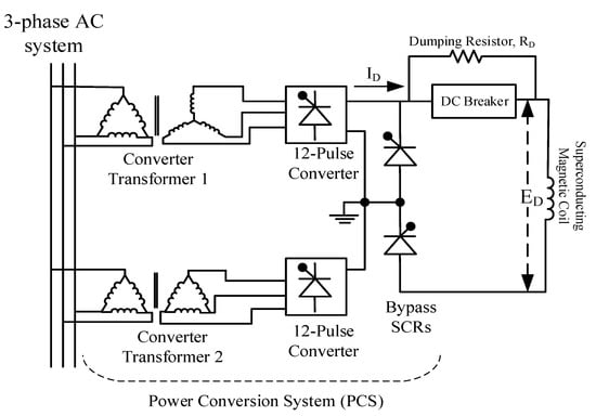 The SMES consists of two main parts: (i) the superconducting coil which is kept under extremely low temperature, and (ii) the power conversion system (PCS)—consisting of inverter/rectifier circuits []. The energy exchange between the superconducting coil and the AC grid is facilitated by the three-phase transformers as shown in Figure 3. Two cascaded 12-pulse bridges filter the harmonic contents of the signals.