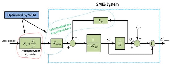 As presented in Figure 4, the SMES virtual inertia based on fractional order PI is developed in this study to support the frequency of the low inertia interconnected system. WOA optimizes the feedback and proportional gains of SMES and the fractional order PI’s proportional gain, integral gain, and fractional parameter. The following subsections describe the formulation of objective function and solution method employing WOA.