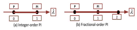 The conventional integer order PI and fractional order PI can be understood by Figure 5 in axis. The integer order controller is represented by two fixed points on the axis. Whereas, the fractional order PI controller can be represented by infinite number of points between 0 and 2. Thus, it gives more degree of freedom and flexibility over the conventional integer order controller.