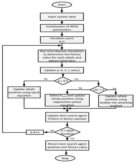 The overall flow chart for the WOA to design fractional order PI and SMES parameters is shown in Figure 6.