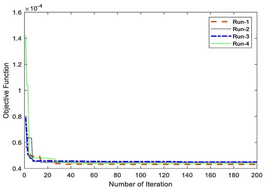 The effectiveness and robustness of the proposed optimized FOC-based SMES to improve the frequency stability are presented in this section. The system modeled in Section 2 is considered for analytical analysis. The system parameters and optimized controller parameters listed in Table 1 and Table 2, respectively, are used to conduct time domain simulations and facilitate analysis. The MATLAB Simulink is used to conduct analyses considering different scenarios such as light loading, heavy loading, solar and wind power variations, and reduced inertia. The frequency deviations in both areas are plotted to show the effectiveness of the proposed FOC. The system dynamic model and optimization code are interlinked to find the optimized parameters. The convergence of the optimization algorithm depicted in Figure 7 shows that most of the runs in simulation converge before 30 iterations.