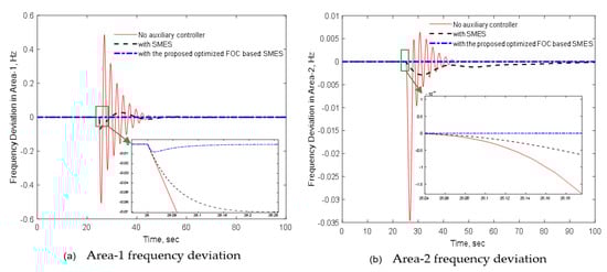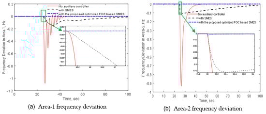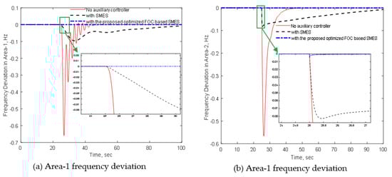 In this scenario, the studied dynamic model of the system is tested under the load profile variations in area-1. The load profiles are step changed in area-1 to observe the frequency response improvement with the proposed FOC-based SMES. The frequency deviations for area-1 and area-2 are plotted in Figure 7a,b for a step load change of 0.1 p.u. at 25 s during time domain simulation. The positive effect of the proposed controller is clearly visualized through the reduction of frequency deviations. As visualized in Figure 8a, a step load change in area-1 causes a significant frequency deviation in area- 1 without virtual inertia controller. The frequency deviation is around 1 Hz without any auxiliary controller. The conventional controller-based SMES improves the deviation to about 0.07 Hz. However, the proposed FOC-based SMES greatly improves the frequency deviation in area-1 which is around 0.01 Hz. The maximum overshoot without any auxiliary controller is 0.5 Hz whereas it is only 0.07 Hz with conventional SMES. The proposed optimized FOC-based SMES has almost zero overshoot. It is noticed that the proposed FOC-based SMES is capable of improving all the performance indices such as maximum overshoot, maximum undershoot and settling time. Likewise, the frequency deviation in area-2 is very high, around 0.04 Hz, without any inertial controller as depicted in Figure 8b. The conventional SMES controller improves frequency deviation to some extent. However, the proposed optimized FOC-based SMES reduces the frequency deviation to almost zero.