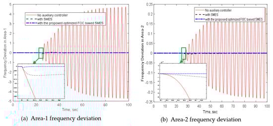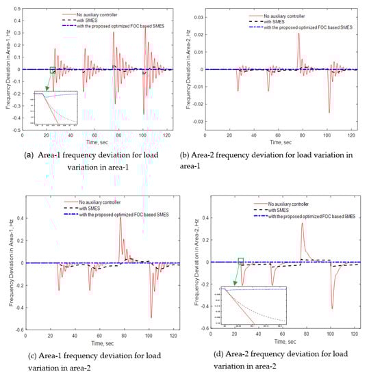A better performance of the proposed optimized FOC-based SMES is clearly visible from the system frequency response. As seen in Figure 13a,b, following the first step load change of 0.075 p.u. at 25 s in area-1, the proposed controller is faster to eliminate the frequency deviation before beginning the second step load change of 0.15 p.u. at 50 s compared to the conventional techniques. The frequency deviations in area-1 are very high at all points of step changes without virtual inertia controller. Although the conventional SMES controller improves the frequency response slightly, a notable improvement is achieved with the proposed technique. In this case, the proposed method also provides much better performance in terms of overshoot, undershoot, and settling time. The frequency responses as visualized in Figure 13c,d show the better performance with the proposed control technique for the multiple load changes in area-2.