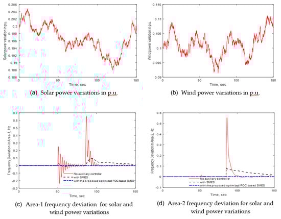 The effectiveness of the proposed controller is also tested with fluctuating solar and wind powers in both areas. The intermittent solar and wind powers considered in this study are depicted in Figure 14a,b, respectively. The solar and wind powers have the mean value of 0.195 p.u. and 0.10 p.u., respectively. The solar power is integrated in area-1 at 50 s during 150 s simulation time which continues to inject fluctuating power during the entire simulation period. On the other hand, the intermittent wind generating unit is connected at 75 s which is kept connected throughout the entire simulation period. As shown in Figure 14c,d, the connection of varying solar and wind powers has detrimental effect on system frequency response without any auxiliary controller. The frequency of the system continues to vary during entire simulation period and does not settle to steady state value. The conventional SMES controller slightly improves the system frequency response. On the other hand, the proposed controller performance is superior, in terms of settling time, overshoot, and undershoot, over the conventional SMES controller. The improvement of several performance indices are listed in Table 3 to demonstrate the superiority of the proposed controller.