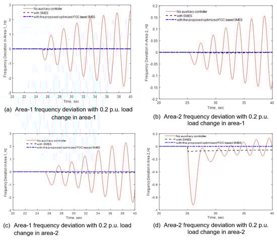 In this case, the robustness of the proposed controller is verified with the system inertia variations. The inertia in both areas is reduced by 50% and a step load change of 0.2 p.u. is applied in area-1and area-2 at 50 s. The frequency response for step load change in area-1 is depicted in Figure 15a,b. As depicted in Figure 8a,b, the system is capable of maintaining stable operation with a step load change of 0.2 p.u. in case of default inertia (100%). However, Figure 15a,b show that the frequency deviations in both areas gradually increase leading to instability. The conventional SMES controller reduces the frequency deviations and stabilizes the system. However, the proposed control method augments the system stability greatly by reducing frequency deviations to almost zero even with the 50% system inertia. Thus, the proposed controller is more robust compared to the conventional technique. The robustness of the proposed optimized FOC-based SMES is also depicted in Figure 15c,d for a 0.2 p.u. step load change in area-2. The frequency deviations in both areas are unbounded without any auxiliary controller. Although the conventional SMES makes the system stable, the proposed FOC-based SMES is superior to stabilize the system after step load disturbance.