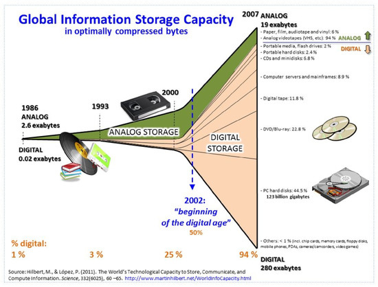 The Internet was therefore one of the main drivers of the steady change that followed its adoption. Most theoreticians pinpoint the start of the IS as the 1970s, which was when the Internet started to be used internally [17]. However, it was the early 1990s and 2000s that brought the most changes and rapid progress through net usage and information dissemination. More widely, information and communication technologies (ICTs) and their usage intensified how we centre our activities in economic, social, cultural and political areas [18]. While the start of the IS can be pinpointed as the early 1970s, the most common recent or golden IS era due to the growth in the amount of data started in approximately 2000 (see Figure 1). The promise of this change was reaffirmed by an international document signed in 2005 called the Tunis Agenda for the Information Society [19], which called for strong financing of ICTs. The reason for such a strong systemic action by many nations was that the use of ICTs resulted in progress for social good and in progress that benefitted the populace; therefore, is was seen as the new foundational grounds for progressing towards a new age in which the IS would be the standard. This progress results in the fast growth of Internet users, as presented in Figure 2. As a consequence, employment needs are shifting and influencing human everyday life.