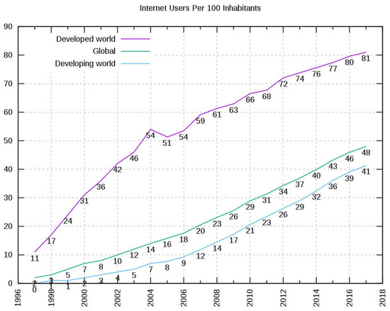 - Global Internet Usage. Available online: https://en.wikipedia.org/wiki/Global_Internet_usage (accessed on 10 December 2020).