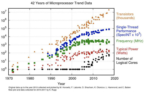 - Borkar, S.; Chien, A.A. The Future of Microprocessors. Commun. ACM 2011, 54, 67. [Google Scholar] [CrossRef]