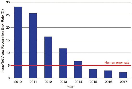 When fed with huge numbers of examples and with fine-tuned parameters, AI methods and, in particular, deep neural networks (DNNs) regularly beat the best human experts in increasing numbers of artificial and real-life tasks [78], such as diagnosing tissue resulting from several diseases. There are other everyday tasks, e.g., the recognition of faces from a picture, where DNNs recognize hundreds of faces in seconds, a result no human can match. Figure 6 demonstrates the progress of DNNs in visual tasks. In approximately 2015, visual recognition using neural networks was slightly better than that of humans in specific domains; now, neural networks have surpassed humans quite significantly in several visual tests, for example, fast recognition of faces in foggy conditions. Research on how human vision works using AI that can inform future advances in artificial vision has also made strides [79]. In one of the core areas of AmI research, human-activity recognition, the application of deep-learning algorithms also achieved human-level results in recent years (see [10,80,81,82]).
