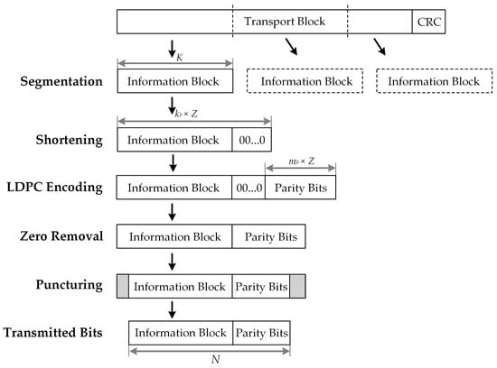 In 5G QC-LDPC codes, a shortening and puncturing process is performed to achieve the desired information lengths and rate adaption. An illustration of the encoding process of 5G QC-LDPC codes is presented in Figure 2.