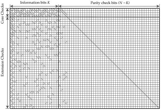 As stated before, QC-LDPC codes play a significant role in 5G NR communications and have been deployed as the error correction coding scheme for the 5G eMBB data channel in 3GPP standard meeting. Figure 1 shows the general structure of the base graph for the NR QC-LDPC codes. The columns are composed of three parts: information columns, core parity columns, and extension parity columns. The rows are divided into two parts: core check rows and extension check rows. As can be observed, the base matrix is partitioned into five submatrices, namely, A, B, O, C, and I [17]. Submatrix A corresponds to systematic bits. In addition, B corresponds to the first set of parity bits and is a square matrix with a dual-diagonal structure: its first column is of weight 3, whereas the submatrix is composed of other columns after the first column has an upper dual-diagonal structure. Submatrix O is an all-zero matrix. For the efficient support of Incremental Redundancy Hybrid Automatic Repeat Request (IR-HARQ), a single parity-check (SPC)-based extension is used to support lower rates, as shown in Figure 1. Submatrix C corresponds to SPC rows, and I is an identity matrix that corresponds to the second set of parity bits, i.e., the SPC extension. The combination of A and B is referred to as the kernel, and the other parts (O, C, and I) are referred to as extensions. This code structure is similar to the Raptor-like extension, as described in [15].