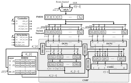The overall decoder architecture is shown in Figure 4. First, the input MUX network aims at selecting between channel intrinsic messages (input LLRs) and LLR messages from the previous layer. It should be noted that intrinsic messages are used only at the initialization stage. Then, the input LLRs of bits quantization is buffered in the input register memory banks, named by PMEM. The specific configuration of PMEM is presented in a later subsection. There are output ports of PMEM and each one represents LLR values of bits (i.e., bits). Consecutively, these 68 outputs are fed to the switch network, which performs a circular shift to the LLR data read from PMEM to align variable nodes with appropriate check nodes based on H-matrix value. A decomposition unit (DCPU) is used for converting the LLR outputs of 224 bits from the switch network into LLR combinations of bits. Then, these 56 LLR combinations of 76 bits and the output data fetched from check to variable messages (RMEM) are passed to check node-based processors. After performing check node and variable node processing, each of these check node-based processors (CNBPs) produces 76 bits updated LLR messages and bits extrinsic check-to-variable messages represented in compressed mode. The CNBP sends messages to the combination unit (CMBU) for the next decoding layer and the compressed messages to check-to-variable node memory RMEM for the next iteration. The CMBU performs the reverse operation of DCPU that converses updated LLR combinations of 76 bits into LLR outputs of 224 bits. It should be noted that the compressed messages from RMEM are fed back to CNBP units through the decompress units (DECOM). Various blocks in the decoder architecture are explained in detail in the following subsections.