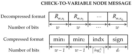 It should be noted that the check-to-variable node message is stored in RMEM as a message of bits. For a check node m, the corresponding message in format is given by the values , where denote the variable nodes connected to m. For a check node m, the corresponding message in format is given by the signs of the above messages, denoted by , their first and second minimum, denoted by and , and the index of the first minimum, denoted by . Figure 6 shows an message in decompressed and compressed format. Hence, the decompression unit DECOM aims at converting this compressed version of LLRs into extrinsic LLRs by using equalizers, MUXs and sign-magnitude to two’s complement conversion units (SMTCs) as shown in Figure 5.