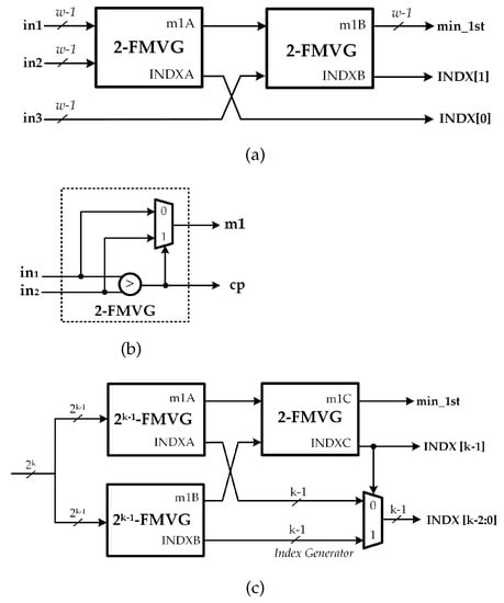 The architecture of the FMVG for inputs is also presented in Figure 7. Since can be decomposed into the sum of 16 and 3, the result of -FMVG block is realized by combining corresponding blocks as described in [34]. The index generator block in Figure 7 is deployed to create the index of the first minimum value. The architecture of 3-FMVG is shown in Figure 8a. Moreover, the -FMVG block, which computes the value and the index of the first minimum among the input messages of bit-width w, can be constructed by cascading multiple 2-FMVGs as shown in Figure 8c. The 2-FMVG unit, as detailed in Figure 8b, is exploited for the comparisons discussed earlier. The comparison signal and output value of the 2-FMVG are defined as follows: