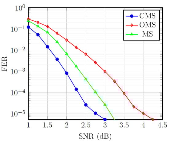 The simulation of proposed low-complexity high-throughput pipelined layered QC-LDPC decoder architecture for 5G NR wireless standard was carried out using BPSK modulation in an AWGN channel environment. Figure 10 illustrates the FER performance of the proposed QC-LDPC decoders on the , for BG1 base matrix of 5G NR wireless standard. The results indicate that the proposed QC-LDPC decoder architecture scheme with bit-width and ten decoding iterations deliver a FER of 10 at 2.75 dB. It can be observed that the CMS decoding provides a better error correction performance compared with the original MS and OMS algorithms.