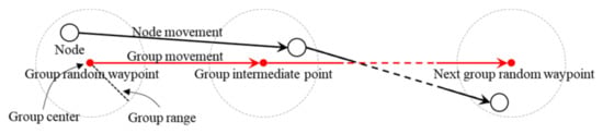 In some network environments, such as military networks, nodes movement follows a group mobility model [12,13,14]. A group consists of a number of member nodes, and they move together based on an assumed group mobility model. In [12], a reference point group mobility model (RPGM) was proposed. In an RPGM, there is a logical center in each group and the mobility of group members follows the movement of the logical center, which includes location, speed, direction, acceleration, etc. Group members are distributed uniformly within the geographic scope of a group. A reference point is assigned to each group member by following the group movement, and a group member is located in the neighborhood of its assigned reference point randomly at each movement. In [13], an RPGM was extended by considering the velocity of groups and group members, and it was called as a reference velocity group mobility model (RVGM). In an RVGM, the mobility of each group is modeled by group velocity, and group members have velocities close to the group velocity, but the velocities have a slight deviation from group velocity. In [14], the authors proposed an ellipse group mobility (EGM) model for tactical MANET, where nodes in a group located in an elliptic region and compared the performance of the EGM model with that of the RPGM. The results showed that the EGM model is better for intergroup communication and worse for intragroup communication.