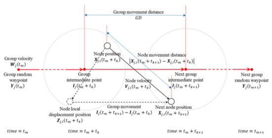 In Figure 2, a group center is at and when and , respectively. A node in a group was at The next position of a node in a group at , , is determined by adding the local displacement position based on cluster mobility model, , and the difference between two consecutive group intermediate points, . Finally, the velocity of a node in a group at is determined as follows: