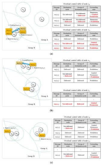 In Figure 3b, is in contact with and is in contact with now. Since is the destination node of , is delivered to from at contact, and is removed from the buffer of after contact. The delivery state and forwarding state of are updated in overload control table of node . After contact of and , receives delivery state and forwarding state information for and delivery state and forwarding state information of are created newly in the overload control table of node .