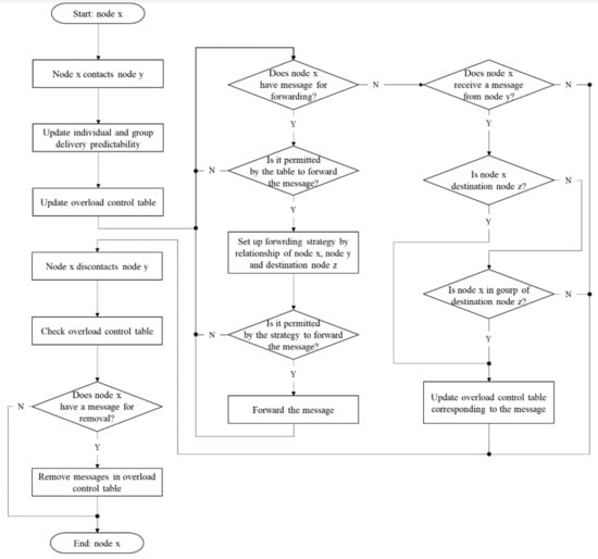 Figure 4 shows a flowchart of the proposed algorithm. When node x and node y contact, they update individual and group delivery predictabilities by exchanging summary vectors, which includes information of messages in their buffer and delivery predictability. Then, they update the overload control table. Node x checks if there is any message for forwarding to node y. If there is any, node x checks the overload control table to check if it is permitted to forward. Then, if it is, the message is forwarded based on the forwarding condition, as proposed in Table 1. If node x receives a message from node y, it firstly checks if it is the destination node z of the message. If it is, the corresponding entry in the overload control table is updated. Otherwise, node x checks if it is located within the same group as the destination node z of the message. If it is, the corresponding entry in the overload control table is updated.
