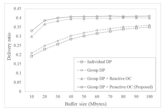 Figure 5 shows the delivery ratio for varying buffer size. Delivery ratios of all the considered protocols increased as buffer size increased but it saturated as the buffer size increased to accommodate messages sufficiently. Routing protocols with overload control had a significantly higher delivery ratio, since they efficiently reduced unnecessary message forwarding. The proposed protocol using group delivery predictability and proactive overload control had a higher delivery ratio by proactively reducing messages that were delivered to a node within the same group as the destination nodes of the messages.