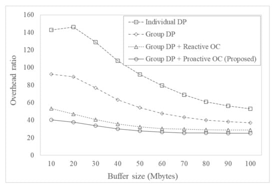Figure 6 shows the overhead ratio for varying buffer size. Overhead ratios of all the considered protocols decreased as buffer size increased. This is because delivery ratio increases as buffer size increases due to the increase of the number of successfully delivered messages, as shown in Equation (9). As can be expected, routing protocols with overload control had significantly lower overhead ratio, since they efficiently reduced unnecessary message forwarding by overload control. The proposed protocol using group delivery predictability and proactive overload control had a lower overhead ratio by proactively reducing messages that were delivered to a node within the same group as the destination nodes of the messages.