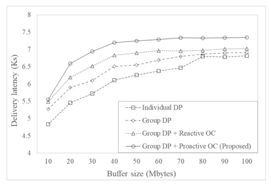 Figure 7 shows the delivery latency for varying buffer size. Delivery latencies of all the considered protocols increased as buffer size increased, since a large buffer accommodates more messages, and thus more time is needed to deliver a message to a destination node through transmission with limited bandwidth and limited contact time. Since protocols with overload control had smaller copies of messages for a given buffer size, more time was needed for them to be delivered to the destination node using a smaller number of forwarded messages. The proposed protocol had the largest delivery latency due to proactive overload control.