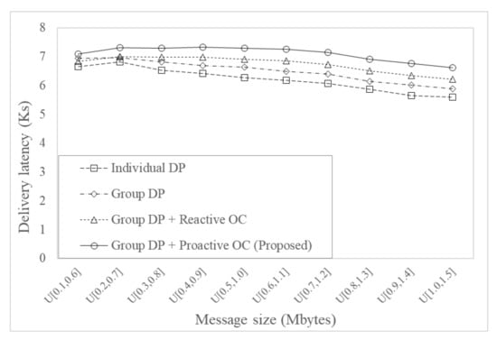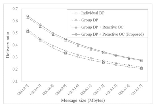Figure 8 shows the delivery ratio for varying the message size with a buffer size of 50 Mbytes. The delivery ratios of all the considered protocols decreased as message size increased. This is because higher messages size generates more message drop due to buffer overflow, and thus results in a lower delivery ratio. The protocols with overload control had a significantly higher delivery ratio than those without overload control by efficiently reducing unnecessary message forwarding. The proposed protocol using group delivery predictability and proactive overload control had a higher delivery ratio by proactively controlling overload.