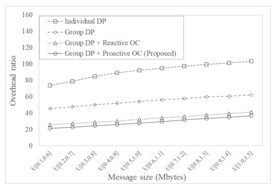 Figure 9 shows the overhead ratio for varying message size with a buffer size of 50 Mbytes. Overhead ratios of all the considered messages increased as message size increased due to the decreased number of successfully delivered messages. Routing protocols with overload control had a significantly lower overhead ratio. The proposed protocol using group delivery predictability and proactive overload control had a lower overhead ratio because of proactive overload control.