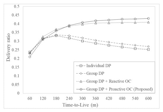 Figure 11 shows the delivery ratio for varying time-to-live (TTL) with a buffer size of 50 Mbytes. The delivery ratio of protocols without overload control increased as TTL value increased from 60 m to 180 m, but it decreased as TTL value increased from 180 m to 600 m. Since the number of message copies increased as TTL increased, thus the delivery ratio also increased because of more message dissemination by increasing the TTL value for small values of TTL. However, if TTL increases for large values of TTL, it is highly likely that more messages are dropped due to buffer overflow at fixed buffer size, since fewer messages are removed because of TTL expiration, and thus delivery ratio decreases. The delivery ratio of protocols with overload control increased as TTL values increased, since the number of message copies could be controlled efficiently using overload control. The proposed protocol had the largest delivery ratio in most of the considered TTL values, except for small TTL values, where the protocol with reactive overload control had a higher delivery ratio than the proposed protocol because of the effect of more message dissemination in small TTL values.