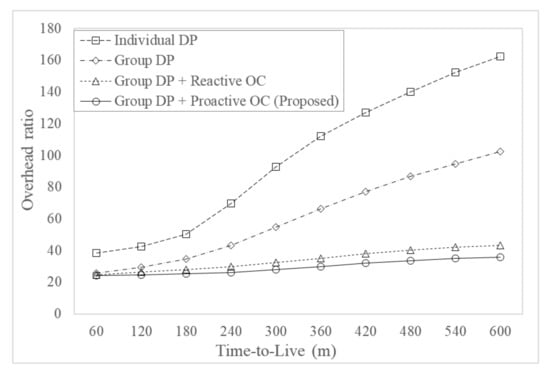 Figure 12 shows the overhead ratio for varying TTL with a buffer size of 50 Mbytes. The overhead of all the protocols increased as TTL values increased due to more message forwarding. The overhead of the protocols with overload control was significantly smaller than those without overload control. Especially, the overhead ratio of the proposed protocol was the smallest due to proactive overload control.