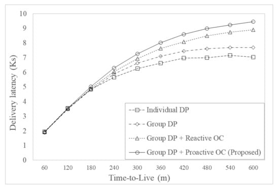 Figure 13 shows delivery latency for varying TTL with a buffer size of 50 Mbytes. The delivery latencies of all considered protocols increased as TTL values increased, since more time was needed to deliver a message to the destination node for large values of TTL using limited transmission speed because of more message copies in the buffer. The proposed protocol had the largest delivery latency, since the proposed protocol proactively removed message copies if they were delivered to any node in the same group of the destination node, and thus more time was needed to deliver a message to a destination node.