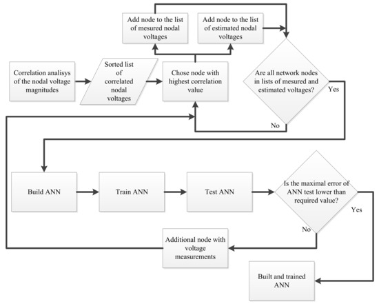 The process of ANN building and determination of network nodes with and without voltage measurement partly includes Step A2, as presented in Figure 3.