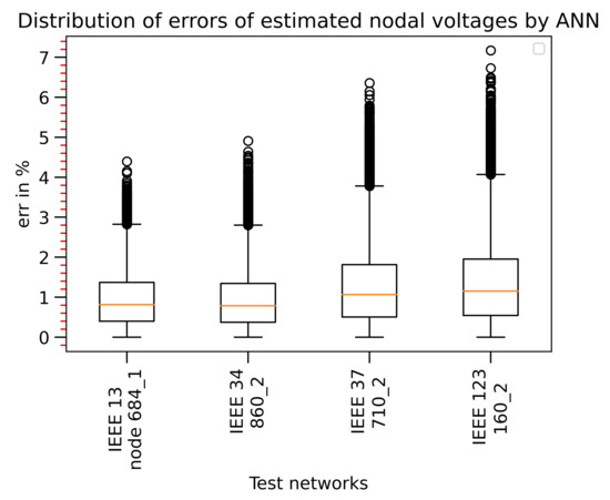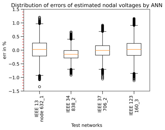 Since measurement devices work with some accuracy, robustness of estimation algorithms is usually investigated. Randomly generated errors were added to the real voltage magnitude values to simulate the measurement errors. The errors were generated by using random numbers in the range from −2% to 2% applying the uniform distribution. Usually, in practice, the accuracy of measurement devices is 1% and lower. However, such a high measurement error limit was intentionally set here to investigate the algorithm robustness for a very unfavorable case. The obtained errors were added to the input data for the procedure of Step A2 after which Steps A3 and B2 were performed. It is interesting to compare errors in estimated voltage magnitudes by Steps A3 and B2 for cases with and without considering measurement errors. Without considering the measurement accuracy, the maximal estimation errors of Step A3 (Table 4) are lower than those obtained by Step B2 (Figure 7). The obtained nodal voltage magnitude considering the measurement errors is given in Figure 9 and Figure 10 in the form of box plots showing error distributions. As can be noted, the voltage magnitude estimation by ANN (Step A3) has lower accuracy comparing the estimation not considering measurement errors (comparison of Table 4 and Figure 9). However, Step B1 (the optimization procedure) significantly improves the estimation quality giving slightly higher estimation errors (in Step B2) than in the case when measurement accuracy is considered (comparison of Figure 7 and Figure 10).