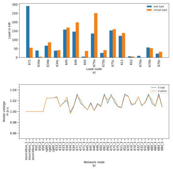 After the nodal voltage magnitudes estimated in Step A3, Stage B started. The estimated voltage magnitudes from the previous step were involved in the objective function (6) and the virtual loads were obtained by performing Step B1. In this step, very interesting and unexpected results were achieved. During the research, it was noted that the optimization procedure can find different load combinations that move nodal voltage magnitudes very close to the given values. This indicates that the optimization problem (6) has more local optimums close to objective function values. This means that the optimization problem is difficult to solve because there is a high possibility the algorithm is stuck in the local optima. Upon analysis, it was noted that the loads found by the optimization are different from the real ones. However, the voltage profile produced by estimated loads is very close to the one produced by real loads. This is a more interesting finding since there are more different load combinations that voltage profiles very close to each other can give. This incidental and unexpected conclusion was drawn from the research. To visualize this conclusion, the examples of the estimated and real load values as well as corresponding voltage profiles for the IEEE 13 node test network are shown in Figure 6. Similar results are obtained for all tested networks.