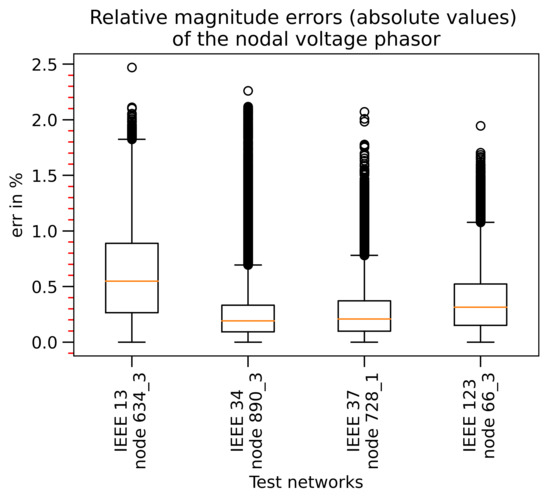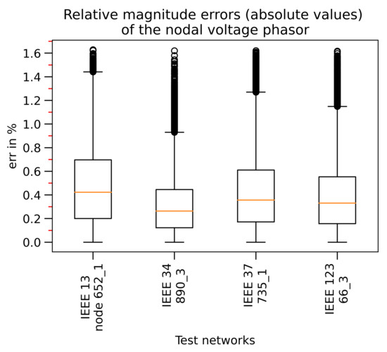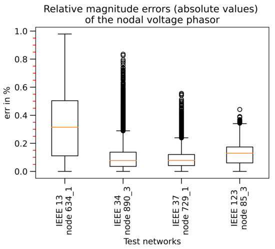 In Figure 7, the distribution of relative errors (absolute amounts) for nodes with the biggest errors (for each tested network) is shown. As shown in the figure, the highest errors do not exceed 1.7% of the voltage phasor magnitude for all used distribution test networks. A very high number of different load combinations (last column in Table 2) was used, and it is interesting to see error distribution in Figure 7. For all tested networks, the mean of the errors is below 0.5% and, for 75% (the third quartile) of data, the error is below 0.7%. Consequently, in the majority of cases, the magnitude voltage error is below 0.7%, 0.5%, 0.6% and 0.6% for IEEE 13, 34, 37 and 123 node test feeders, respectively. This applies to nodes with the highest errors while other nodes have even lower errors.
