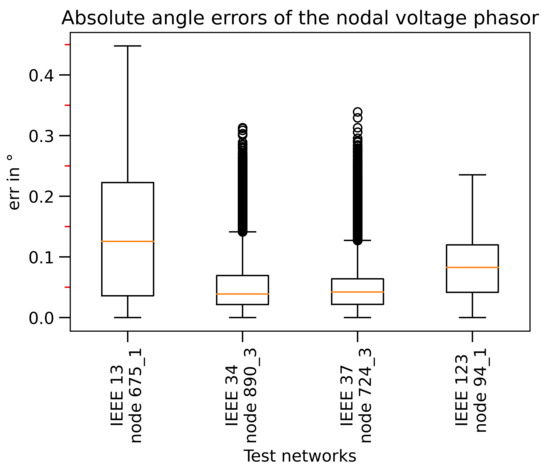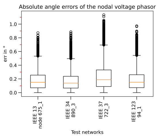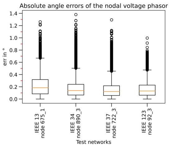 The absolute angle errors are given in Figure 8. In this case, the absolute values are shown instead of the percentage error since the referent phase has a phase angle of 0. Due to this, even a small absolute error will result in a high percentage error. For two other phases (with phase shift angles of 120 and −120) there is no such numerical problem, e.g., the absolute error of 0.2 will result in a percentage error of about 20% for the referent phase and about 0.17% for the two other phases. The maximum phasor angle error is below 1.15 (IEEE 37 node test feeder) and below 0.4 in 75% of tested cases.