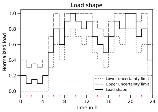 The consumers’ load shapes are very often known (with more or less uncertainty) in the distribution power network. The load shapes are usually characterized by a consumer type and day/season type. The application of the proposed method was applied to the scenario when the distribution network operator had a load shape of the customers. The load shape, given in Figure 12, was used in the simulations.