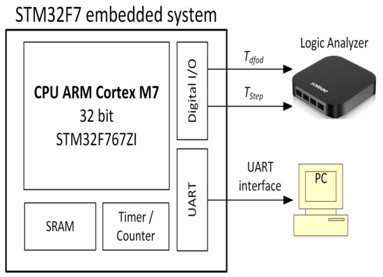 The diagram of the embedded system used in experiments is shown in Figure 1. The STM32F767ZI device is based on the high-performance Arm® Cortex®-M7 32-bit RISC core operating at up to 216 MHz frequency. The Cortex®-M7 core features a floating point unit (FPU) which supports Arm® double-precision and single-precision data-processing instructions and data types. It also implements a full set of DSP instructions. The embedded system was tested using the following peripheral blocks integrated in the structure: SRAM memory for storing data tables, timer/counter units capable of interrupts, and a serial port UART. The processed data are duly transmitted (via an UART port), monitored, and uploaded to a PC. The FOPD and CFE algorithms were run in the timer interrupt procedure of the STM32 timer.