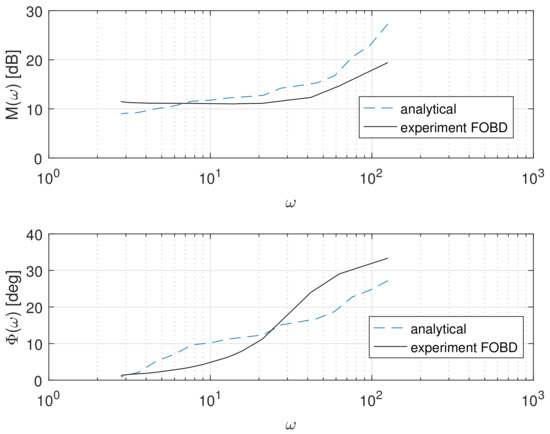 Firstly, the FOBD was tested. The memory length during calculations was equal . Bode diagrams were tested using a sine wave with a frequency range of 0.44–20.0 Hz. They are shown in the Figure 2. The comparison experimental vs. analytical Bode diagrams is illustrated by Figure 3. The analytical Bode diagrams were calculated for half-order FOPID using (12).