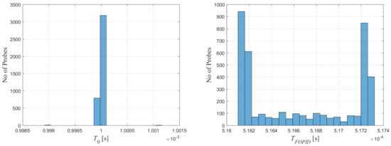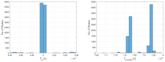 Appropriate histograms were determined in order to check the sampling period stability and calculate the PID algorithm execution time. The duration of calculations is presented in histograms Figure 7. The histograms were collected using a logic analyser, and the accuracy of time measurements was equal to 20 [ns]. The histogram on the left shows the keeping of sample time during calculations, and on the right it illustrates the duration of calculation of the control signal by a FOBD algorithm.
