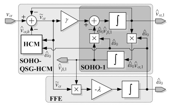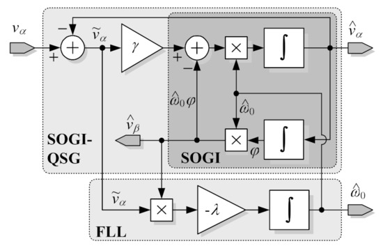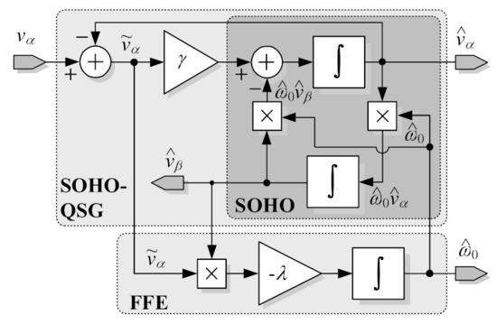 Notice that the SOGI-based FLL involves a scheme that also generates the orthogonal signals (SOGI-QSG), and a scheme to estimate the fundamental frequency (FLL). However, there are significant structural differences between the blocks named SOHO and SOGI, which are described next.