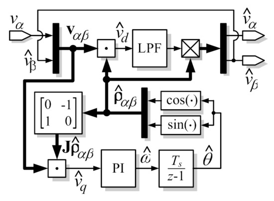 Moreover, despite the synchronization in three-phase systems, possibly motivated by traditional power systems (see some applications in REG systems [12,13]), single-phase PLLs are becoming of central interest for investigation and development due to the current massive deployment of grid-tie inverters at residential levels, due to domestic photovoltaic (PV) installations [14]. Additionally, PLL has been extensively used for the control purposes and for stability improvement [15,16]. Initially, the main idea of single-phase PLLs was to follow a similar approach as that of the balanced three-phase case, i.e., by generating orthogonal signals, which seemingly fit in the context of (fixed-frame) -coordinates, where the single-phase synchronous reference frame (SRF)-based PLL is widely used thanks to its desirable performance and its simple yet robust structure, see for instance [5,17]. In [17], an extension of the well-known three-phase SRF-based PLL is presented, for the single-phase case. This intuitive solution provides a good platform for the development of future improvements in terms of disturbance rejection, harmonic compensation and so forth.