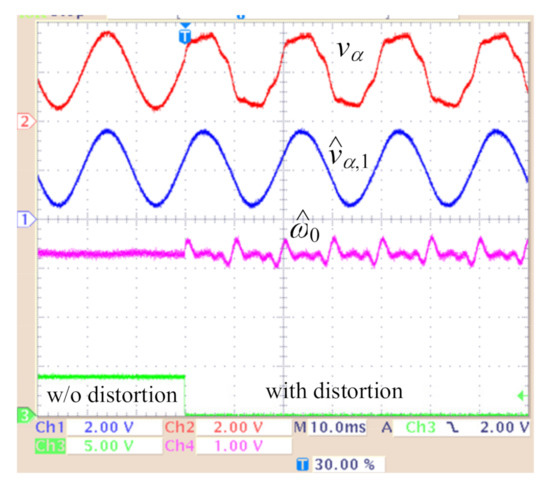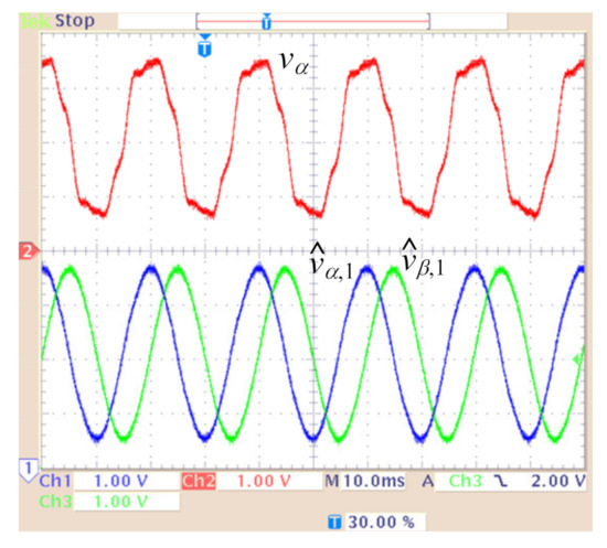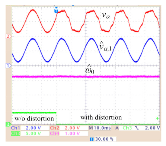 Steady state responses of the proposed SOHO-based FLL at = 50 Hz of (top) , and (bottom) and (x-axis: 10 ms/div; y-axis: 200 V/div).
