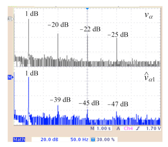 Figure 9 shows the frequency spectra, under the SOHO-based FLL, obtained by means of the fast Fourier transform (FFT) of (top) the reference , and (bottom) the estimate for a fundamental frequency fixed to 50 Hz. The estimated for the SOHO-based scheme achieves a THD of 1.25%, which can be calculated from Figure 9. The frequency spectra of the SOGI-based FLL and the SRF-based PLL are very similar to the spectrum of the SOHO-based scheme. They are ommited here for the sake of space limitation. In the case of the SOGI-based FLL the THD of the estimated achieves a THD of 1.6%, while the THD for the SRF-based PLL achieves 1.9%. Notice that all three THDs are much smaller than the THD of 14.5% of .