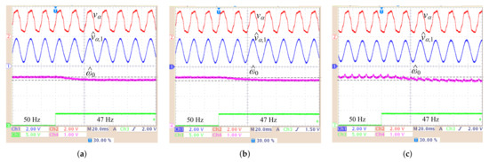 Transient responses after a step change in the fundamental frequency from 50 Hz to 47 Hz for: (a) the SOHO-based FLL, (b) the SOGI-based FLL, and (c) the SRF-based PLL. (top) , (x-axis: 10 ms/div; y-axis: 400 V/div) (middle) (x-axis 10 ms/div; y-axis 97.66 rad/s/div) and (bottom) step-change enable signal.