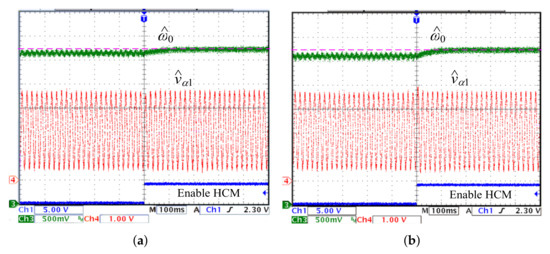 Figure 11a,b show the transient response of the estimated frequency (in the top plots) and the estimated after the HCM is enabled in the proposed SOHO-based FLL and in the SOGI-based FLL, respectively. The enabling signal is depicted in the bottom plot, while the fundamental frequency reference rad/s is marked with a dotted line on the top plots of both figures. Notice that, as above described, before enabling the corresponding HCM, a small ripple and a slight steady state error with respect to rad/s are observed in both cases. In particular, the SOGI-based FLL exhibits a slightly bigger steady state error before the HCM is enabled. Then, after the HCM is enabled, both the ripple and the steady state error are minimized in both cases.