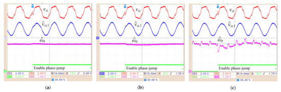 Transient responses due to a phase jump of degrees, while maintaining a constant = 50 Hz of (a), the proposed SOHO-based scheme, (b) the SOGI-based FLL scheme, and (c) the SRF-based PLL: (from top to bottom) , (y-axis: 400 V/div), (y-axis: 97.66 rad/s/div), and (bottom) phase-jump enable signal (x-axis: 10 ms/div in all plots).