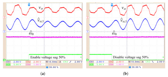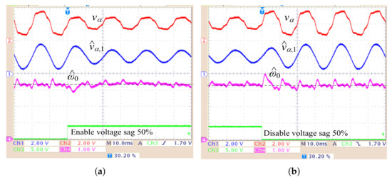 Transient responses of the proposed SOHO-based FLL after a voltage sag (a) from to , and (b) back from to , while keeping = 50 Hz and with harmonic distortion: (from top to bottom) , (y-axis: 400 V/div), (x-axis: 10 ms/div; y-axis: 97.66 rad/s/div), and voltage-sag enable signal (x-axis: 10 ms/div in all plots).