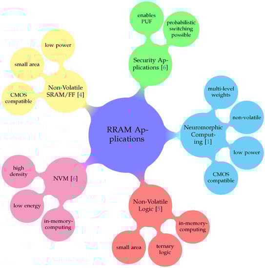 RRAM devices are interesting for the applications mentioned above because of their advantages as a memory technology, which are also shown in Figure 1. Since most RRAM technologies rely on switching in thin, dielectric layers, the area of individual cells can be kept very small compared to other memory technologies like SRAM or even flash memory. Some RRAM technologies can even surpass the area of , where is the minimum feature size, due to 3D integration [7]. This goes along well with the further scaling in modern semiconductor processes. Because the physical effect used to store the data relies on a structural change in the crystal lattice of the dielectric material, RRAM cells can keep their stored value after shut down of the supply voltage. This non-volatility is a key feature, especially for data storage and logical operations in low-power applications. These applications usually use batteries or energy harvesting, since they operate in circumstances where the energy supply cannot always be guaranteed. Therefore, data loss can be prevented by the non-volatility of the RRAM cells, when power runs low. The ability to adopt more than two resistive states permits the storage of several bits in one RRAM cell, therefore allowing a higher memory density. These three key advantages, small area, non-volatility and multi-state capability, ensure a promising future for RRAM devices in a wide variety of memory, Artificial Intelligence (AI) and Machine Learning (ML) applications [6,7,8].